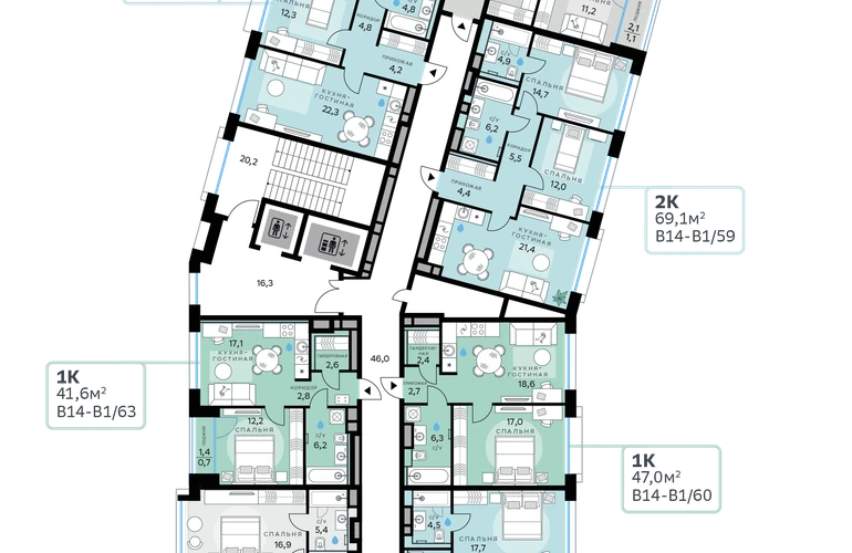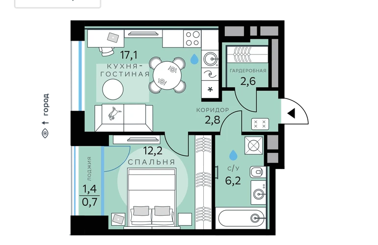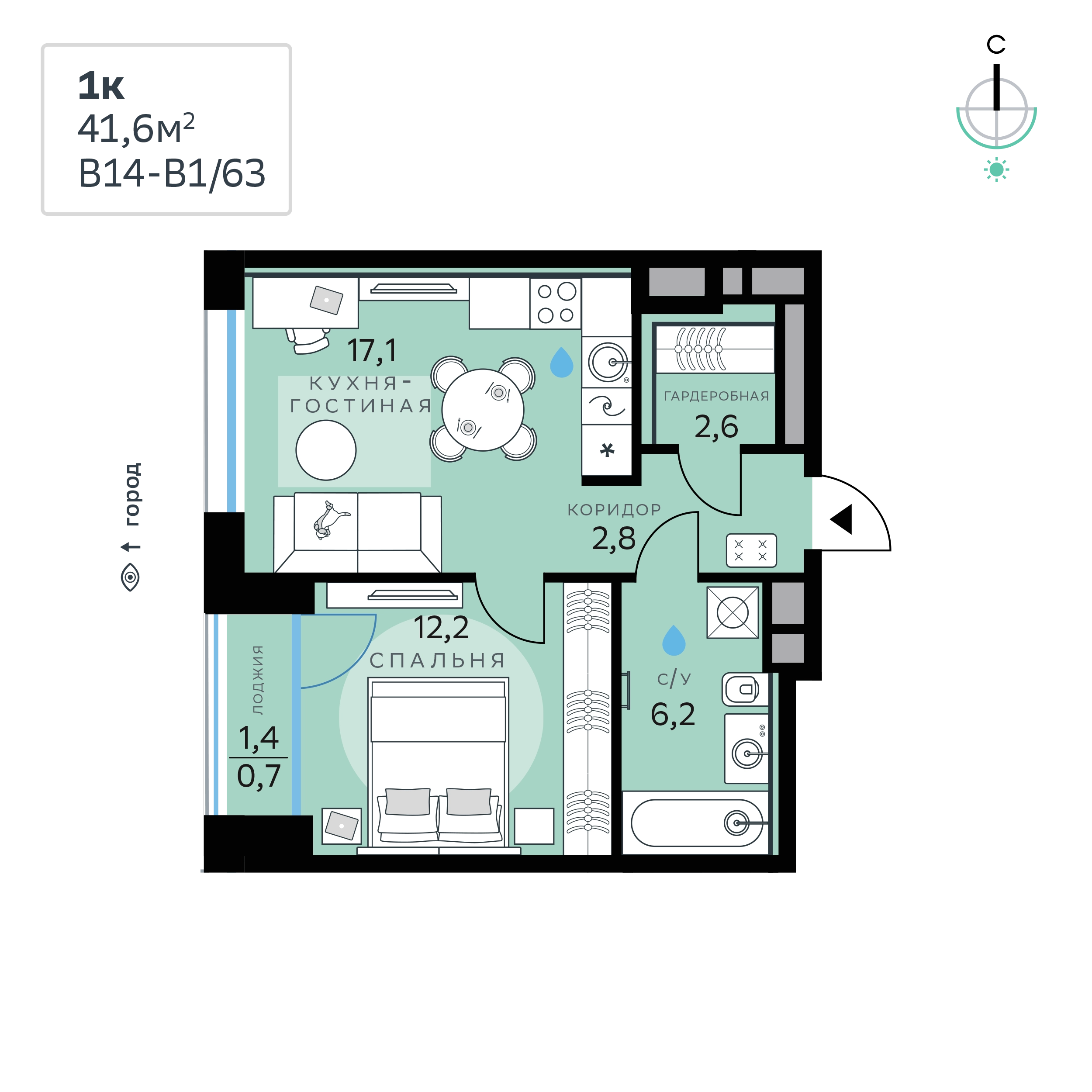 В продаже — однокомнатная квартира с чистовой отделкой, общей площадью 41,6 кв. м. Квартира расположена на восьмом этаже десятиэтажного корпуса Балансд в квартале В14 нового района СберСити, который строит Сбер.Архитектуру корпусов квартала разработало итальянское бюро. В облике отражена природная палитра: для фасадов выбраны небесно-голубой и травянистый зелёный оттенки. Декоративные металлические рамы окон и эркеры служат выразительными акцентами. Из окон открываются виды на парк и закаты над рекой. Всего в трёх минутах пешком — набережная, а рядом — главный парк СберСити. Во дворах без машин — много зелени, деревьев, кустарников и многолетних растений, детские площадки и тихие зоны отдыха.