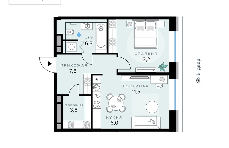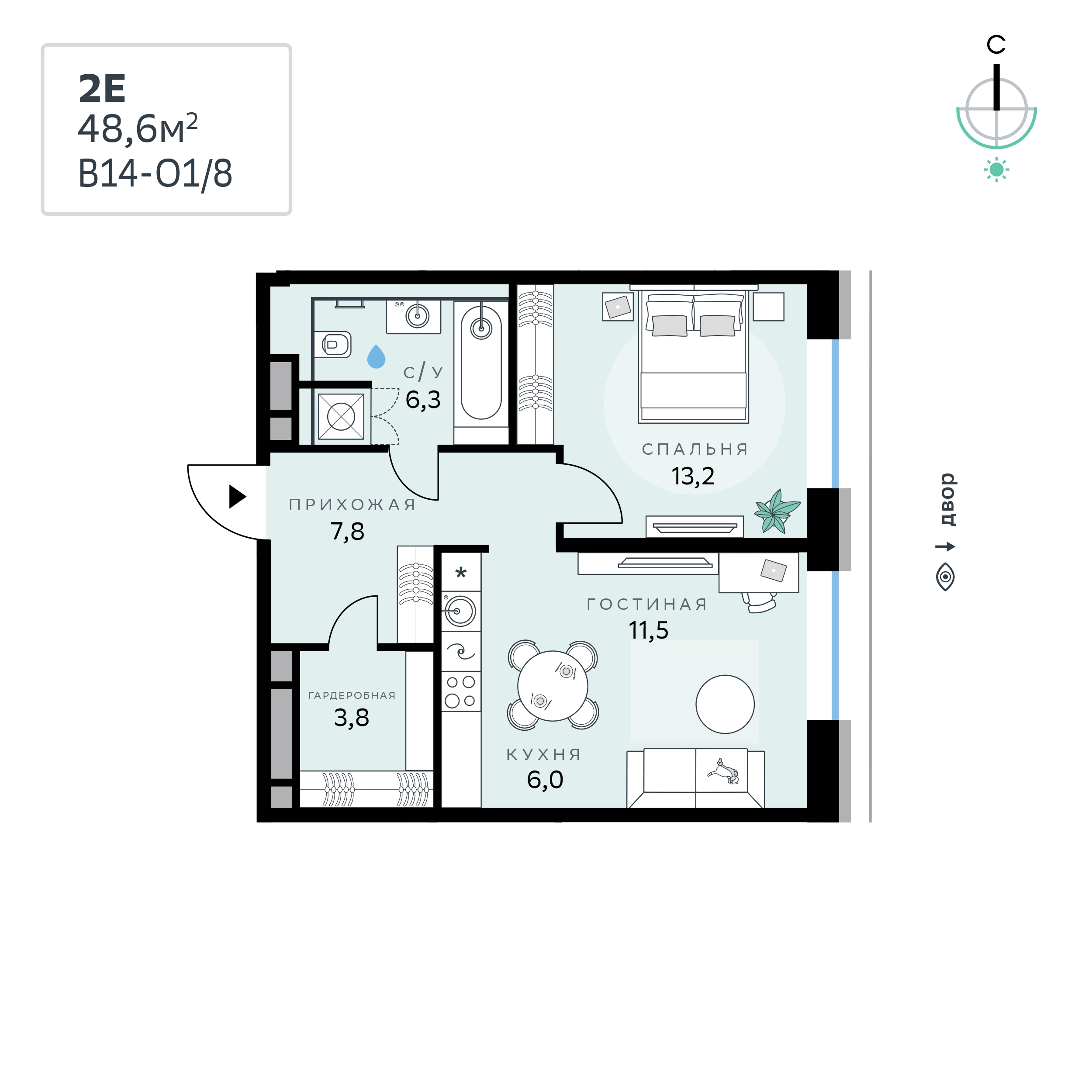 В продаже — однокомнатная квартира с чистовой отделкой, общей площадью 48,2 кв. м. Квартира расположена на втором этаже десятиэтажного корпуса Оптимум в квартале В14 нового района СберСити, который строит Сбер.Архитектуру корпусов квартала разработало итальянское бюро. В облике отражена природная палитра: фасады выполнены в тёплой гамме и отличаются геометричной сеткой объёмных элементов светло-бежевого оттенка. За ними скрываются вставки с текстурой под дерево, создающие игру света и тени. Из окон открываются виды на парк и реку, а всего в трёх минутах пешком — набережная. В14 примыкает к главному парку СберСити. В квартале — уютные дворы без машин с крупномерными растениями, кустарниками, многолетними цветами, детскими площадками и зонами отдыха.