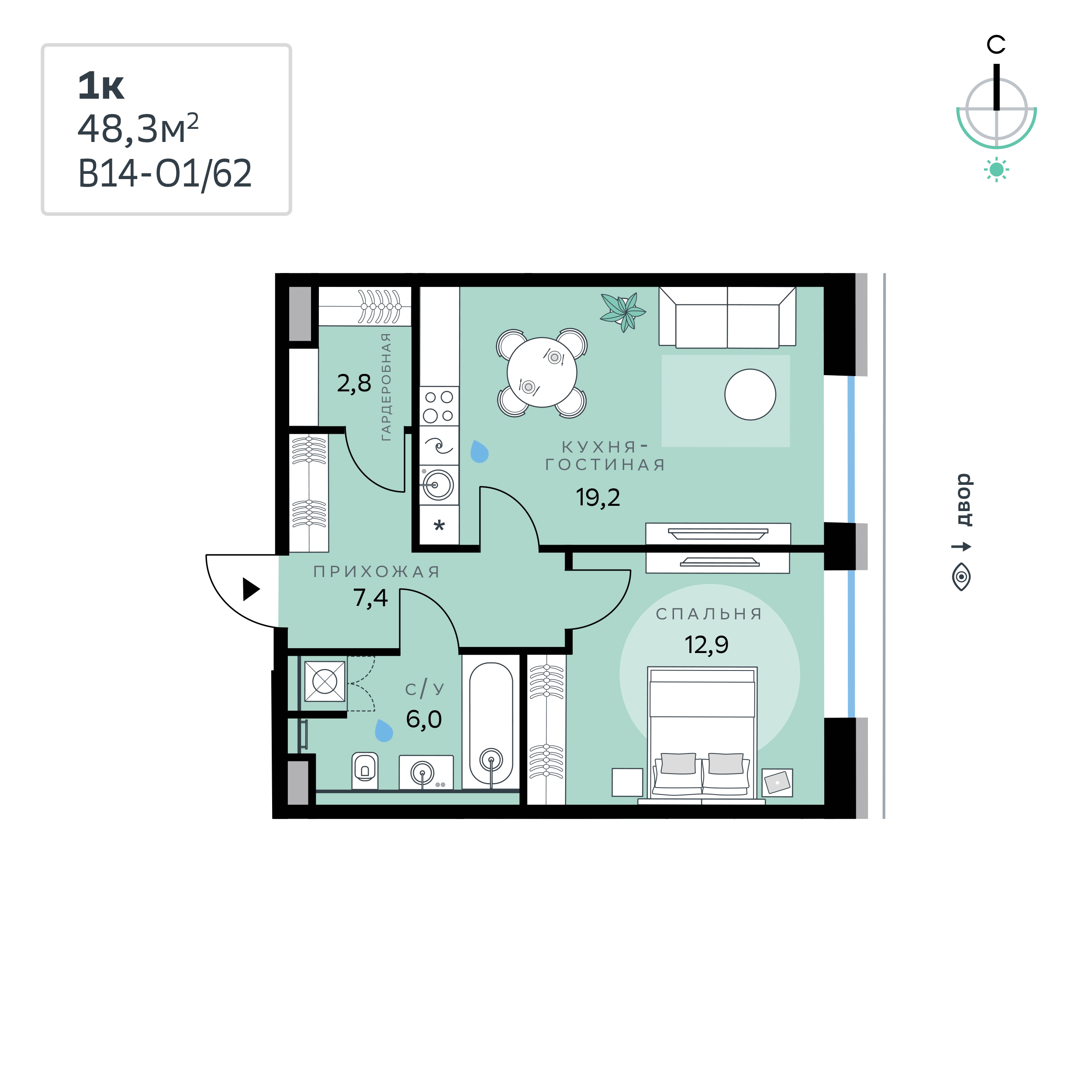 В продаже — однокомнатная квартира с чистовой отделкой, общей площадью 48,3 кв. м. Квартира расположена на первом этаже одинадцатиэтажного корпуса Оптимум в квартале В14 нового района СберСити, который строит Сбер.Архитектуру корпусов квартала разработало итальянское бюро. В облике отражена природная палитра: фасады выполнены в тёплой гамме и отличаются геометричной сеткой объёмных элементов светло-бежевого оттенка. За ними скрываются вставки с текстурой под дерево, создающие игру света и тени. Из окон открываются виды на парк и реку, а всего в трёх минутах пешком — набережная. В14 примыкает к главному парку СберСити. В квартале — уютные дворы без машин с крупномерными растениями, кустарниками, многолетними цветами, детскими площадками и зонами отдыха.