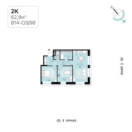 В продаже — двухкомнатная квартира с чистовой отделкой, общей площадью 62,8 кв. м. Квартира расположена на шестом этаже одинадцатиэтажного корпуса Оптимум в квартале В14 нового района СберСити, который строит Сбер.Архитектуру корпусов квартала разработало итальянское бюро. В облике отражена природная палитра: фасады выполнены в тёплой гамме и отличаются геометричной сеткой объёмных элементов светло-бежевого оттенка. За ними скрываются вставки с текстурой под дерево, создающие игру света и тени. Из окон открываются виды на парк и реку, а всего в трёх минутах пешком — набережная. В14 примыкает к главному парку СберСити. В квартале — уютные дворы без машин с крупномерными растениями, кустарниками, многолетними цветами, детскими площадками и зонами отдыха.