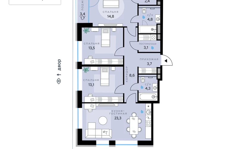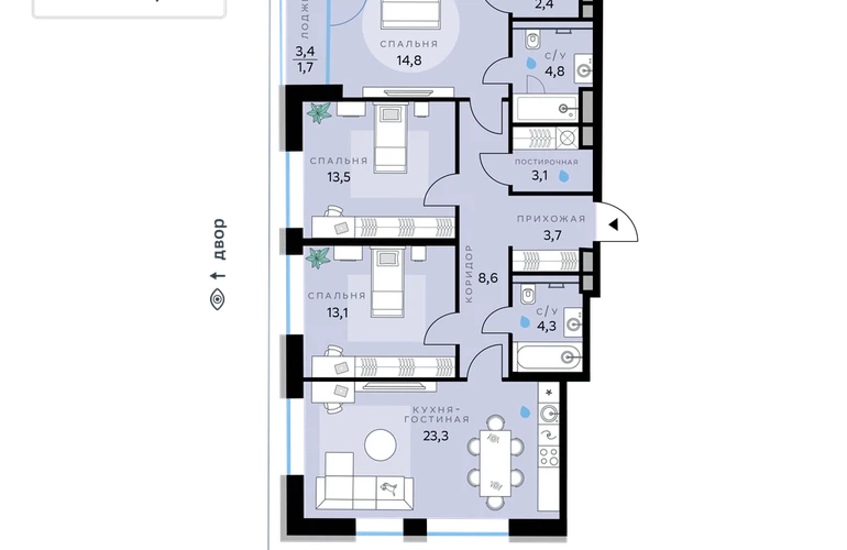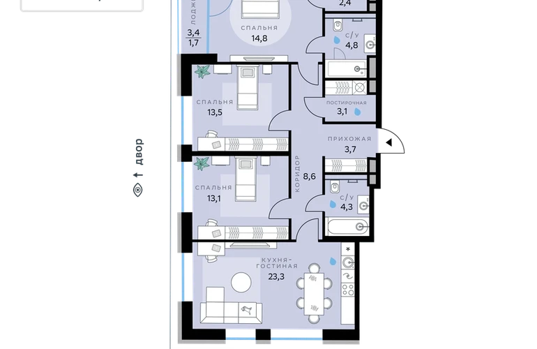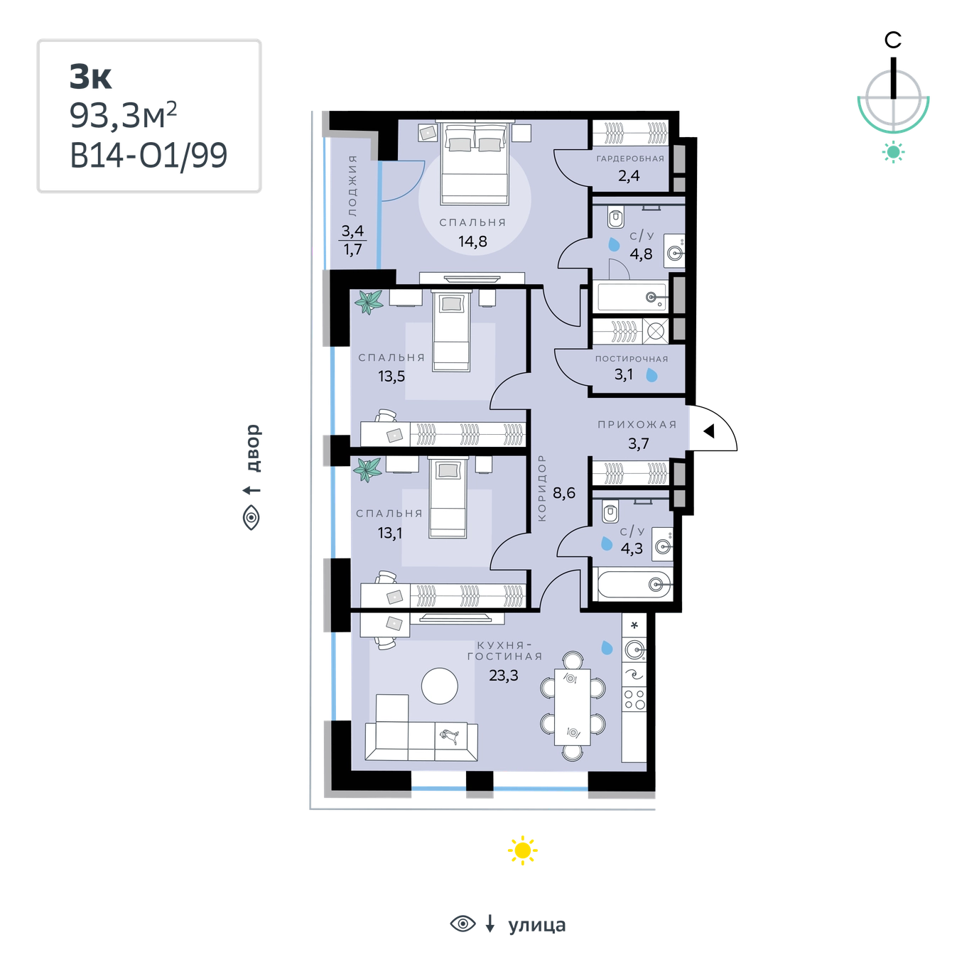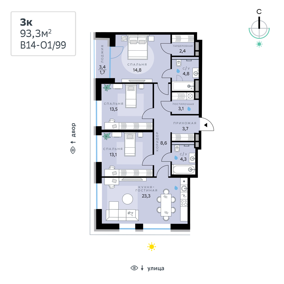 В продаже — трехкомнатная квартира с чистовой отделкой, общей площадью 93,3 кв. м. Квартира расположена на шестом этаже одинадцатиэтажного корпуса Оптимум в квартале В14 нового района СберСити, который строит Сбер. Архитектуру корпусов квартала разработало итальянское бюро. В облике отражена природная палитра: фасады выполнены в тёплой гамме и отличаются геометричной сеткой объёмных элементов светло-бежевого оттенка. За ними скрываются вставки с текстурой под дерево, создающие игру света и тени. Из окон открываются виды на парк и реку, а всего в трёх минутах пешком — набережная. В14 примыкает к главному парку СберСити. В квартале — уютные дворы без машин с крупномерными растениями, кустарниками, многолетними цветами, детскими площадками и зонами отдыха. Дом возводится по технологии монолитного строительства. Фасады отделаны крупноформатными панелями из стеклофибробетона с фактурой натурального камня и HPL-панелями под дерево. В квартирах предустановлена система «умный дом», связывающая квартиру, дом и прилегающую территорию. Можно регулировать климат и освещение голосом или со смартфона, установлена защита от протечек. Повышенная шумоизоляция и двухкамерные стеклопакеты с алюминиевым профилем обеспечивают комфорт и тишину. В санузлах установлен тёплый пол. В доме предусмотрены: – уютное лобби, – общественная терраса, – детская игровая комната на первом этаже, – лапомойка, – колясочная и велосипедная комната на первом этаже, – подземный паркинг. СберСити — это новый жилой и деловой район на западе Москвы, в одном из самых экологически чистых и престижных мест столицы. Это первая в России и крупнейшая в мире инновационная городская среда, созданная по международным стандартам зелёного проектирования. Здесь внедряются решения в области энергоснабжения, вакуумного мусороудаления, тестирования зелёных технологий, а в дальнейшем — системы искусственного интеллекта для управления домами и городской инфраструктурой. Строительство проекта началось в 2021 году, заселение первых корпусов — с лета 2024-го. Общая площадь территории — 461 га, из них более 2,5 млн кв. м жилья и около 833 тыс. кв. м офисных пространств. Будет построено 7 школ, 13 детских садов и 2 поликлиники. В СберСити будут жить 65 тыс. человек и работать 70 тыс. Развитием территории занимается АО «Рублёво-Архангельское», входящее в группу Сбер. СберСити — место, где хочется жить, работать и растить детей. Переезжайте в СберСити!О застройщике