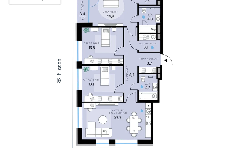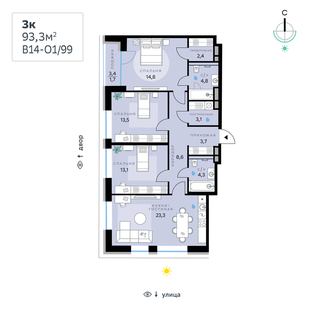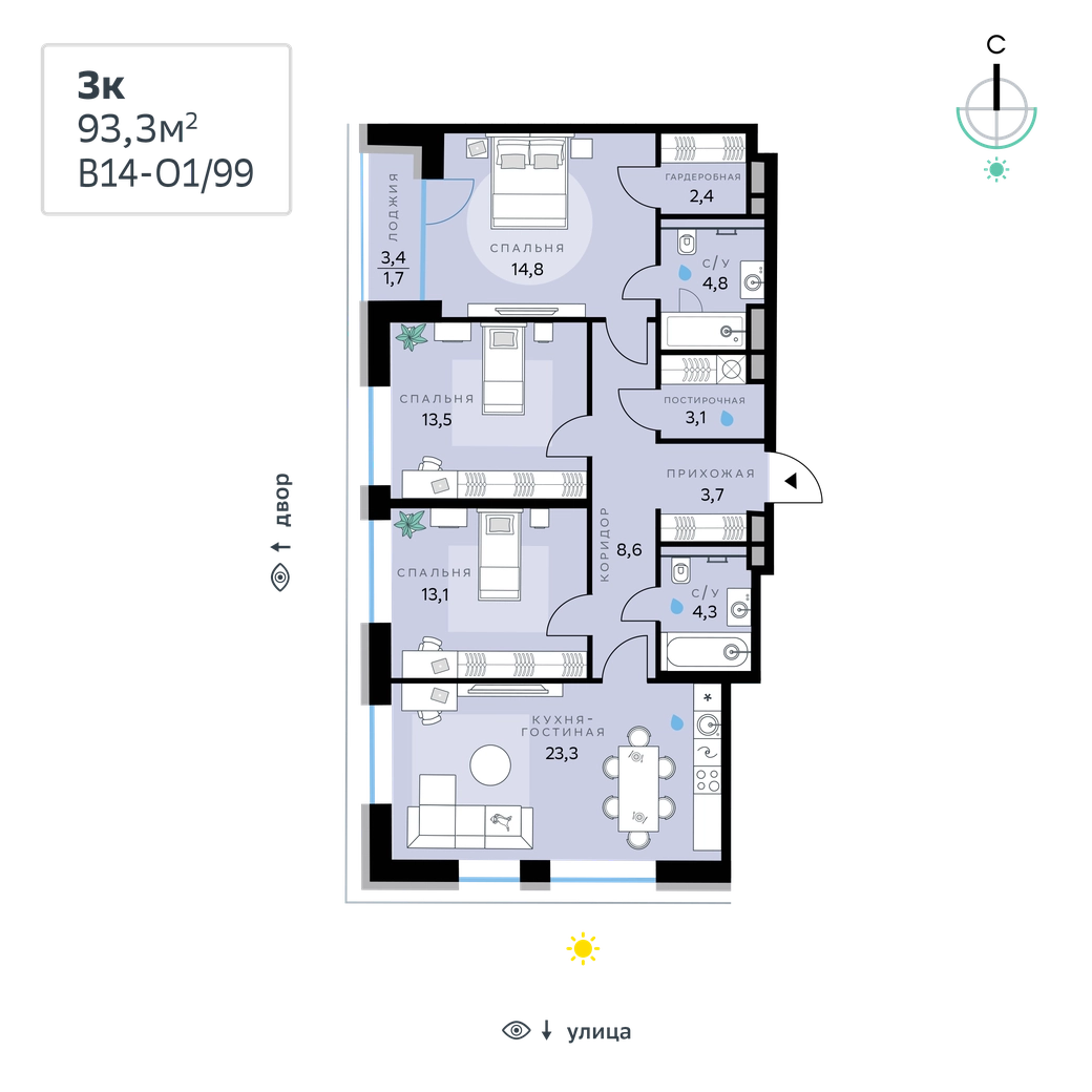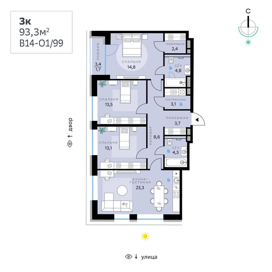 В продаже — трехкомнатная квартира с чистовой отделкой, общей площадью 93,3 кв. м. Квартира расположена на шестом этаже одинадцатиэтажного корпуса Оптимум в квартале В14 нового района СберСити, который строит Сбер. Архитектуру корпусов квартала разработало итальянское бюро. В облике отражена природная палитра: фасады выполнены в тёплой гамме и отличаются геометричной сеткой объёмных элементов светло-бежевого оттенка. За ними скрываются вставки с текстурой под дерево, создающие игру света и тени. Из окон открываются виды на парк и реку, а всего в трёх минутах пешком — набережная. В14 примыкает к главному парку СберСити. В квартале — уютные дворы без машин с крупномерными растениями, кустарниками, многолетними цветами, детскими площадками и зонами отдыха. Дом возводится по технологии монолитного строительства. Фасады отделаны крупноформатными панелями из стеклофибробетона с фактурой натурального камня и HPL-панелями под дерево. В квартирах предустановлена система «умный дом», связывающая квартиру, дом и прилегающую территорию. Можно регулировать климат и освещение голосом или со смартфона, установлена защита от протечек. Повышенная шумоизоляция и двухкамерные стеклопакеты с алюминиевым профилем обеспечивают комфорт и тишину. В санузлах установлен тёплый пол. В доме предусмотрены: – уютное лобби, – общественная терраса, – детская игровая комната на первом этаже, – лапомойка, – колясочная и велосипедная комната на первом этаже, – подземный паркинг. СберСити — это новый жилой и деловой район на западе Москвы, в одном из самых экологически чистых и престижных мест столицы. Это первая в России и крупнейшая в мире инновационная городская среда, созданная по международным стандартам зелёного проектирования. Здесь внедряются решения в области энергоснабжения, вакуумного мусороудаления, тестирования зелёных технологий, а в дальнейшем — системы искусственного интеллекта для управления домами и городской инфраструктурой. Строительство проекта началось в 2021 году, заселение первых корпусов — с лета 2024-го. Общая площадь территории — 461 га, из них более 2,5 млн кв. м жилья и около 833 тыс. кв. м офисных пространств. Будет построено 7 школ, 13 детских садов и 2 поликлиники. В СберСити будут жить 65 тыс. человек и работать 70 тыс. Развитием территории занимается АО «Рублёво-Архангельское», входящее в группу Сбер. СберСити — место, где хочется жить, работать и растить детей. Переезжайте в СберСити!О застройщике