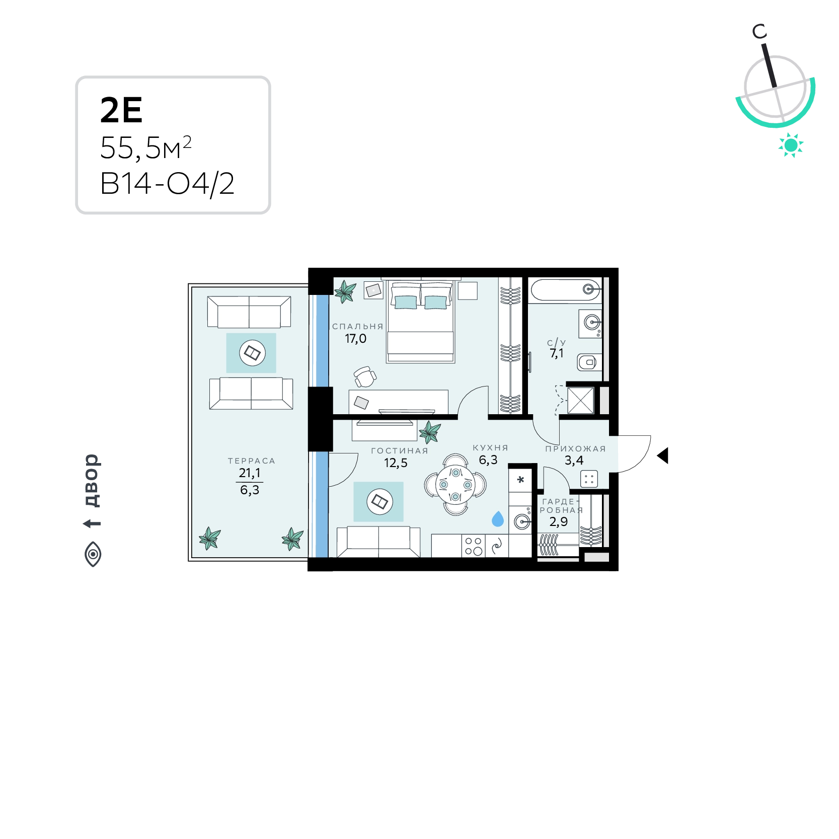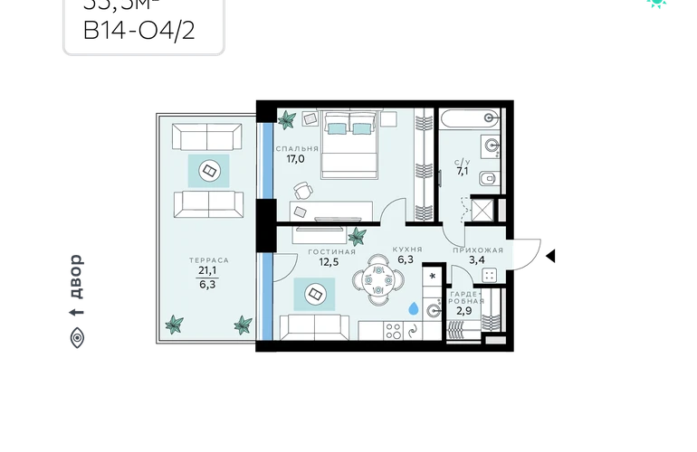 В продаже — однокомнатная квартира, общей площадью 55,5 кв. м. Квартира расположена на первом этаже девятиэтажного корпуса Оптимум в квартале В14 нового района СберСити, который строит Сбер.Архитектуру корпусов квартала разработало итальянское бюро. В облике отражена природная палитра: фасады выполнены в тёплой гамме и отличаются геометричной сеткой объёмных элементов светло-бежевого оттенка. За ними скрываются вставки с текстурой под дерево, создающие игру света и тени. Из окон открываются виды на парк и реку, а всего в трёх минутах пешком — набережная. В14 примыкает к главному парку СберСити. В квартале — уютные дворы без машин с крупномерными растениями, кустарниками, многолетними цветами, детскими площадками и зонами отдыха.