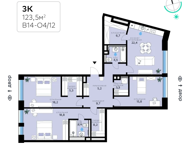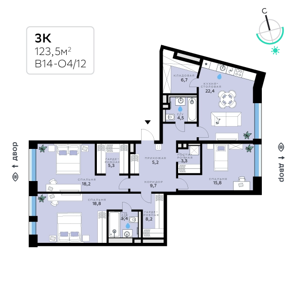 В продаже — трехкомнатная квартира, общей площадью 123,5 кв. м. Квартира расположена на втором этаже девятиэтажного корпуса Оптимум в квартале В14 нового района СберСити, который строит Сбер.Архитектуру корпусов квартала разработало итальянское бюро. В облике отражена природная палитра: фасады выполнены в тёплой гамме и отличаются геометричной сеткой объёмных элементов светло-бежевого оттенка. За ними скрываются вставки с текстурой под дерево, создающие игру света и тени. Из окон открываются виды на парк и реку, а всего в трёх минутах пешком — набережная. В14 примыкает к главному парку СберСити. В квартале — уютные дворы без машин с крупномерными растениями, кустарниками, многолетними цветами, детскими площадками и зонами отдыха.