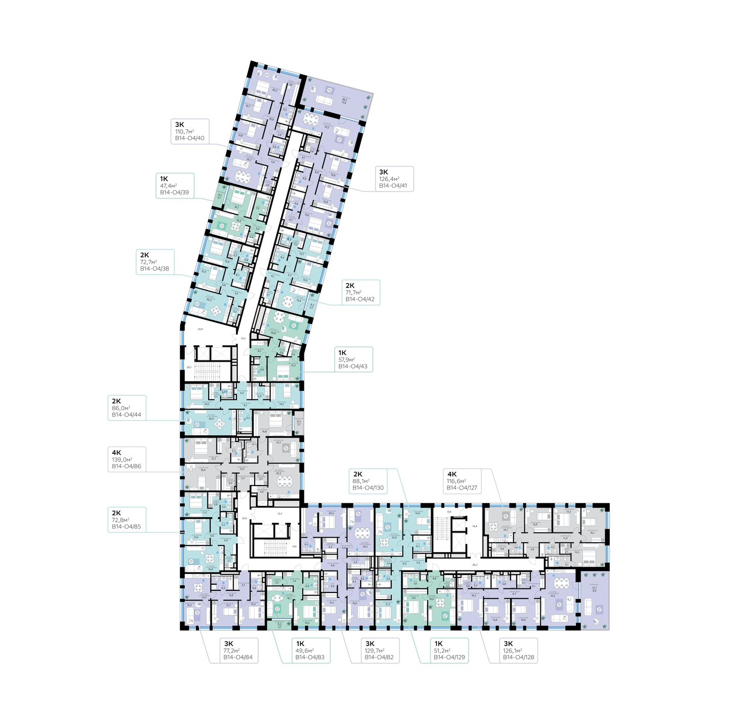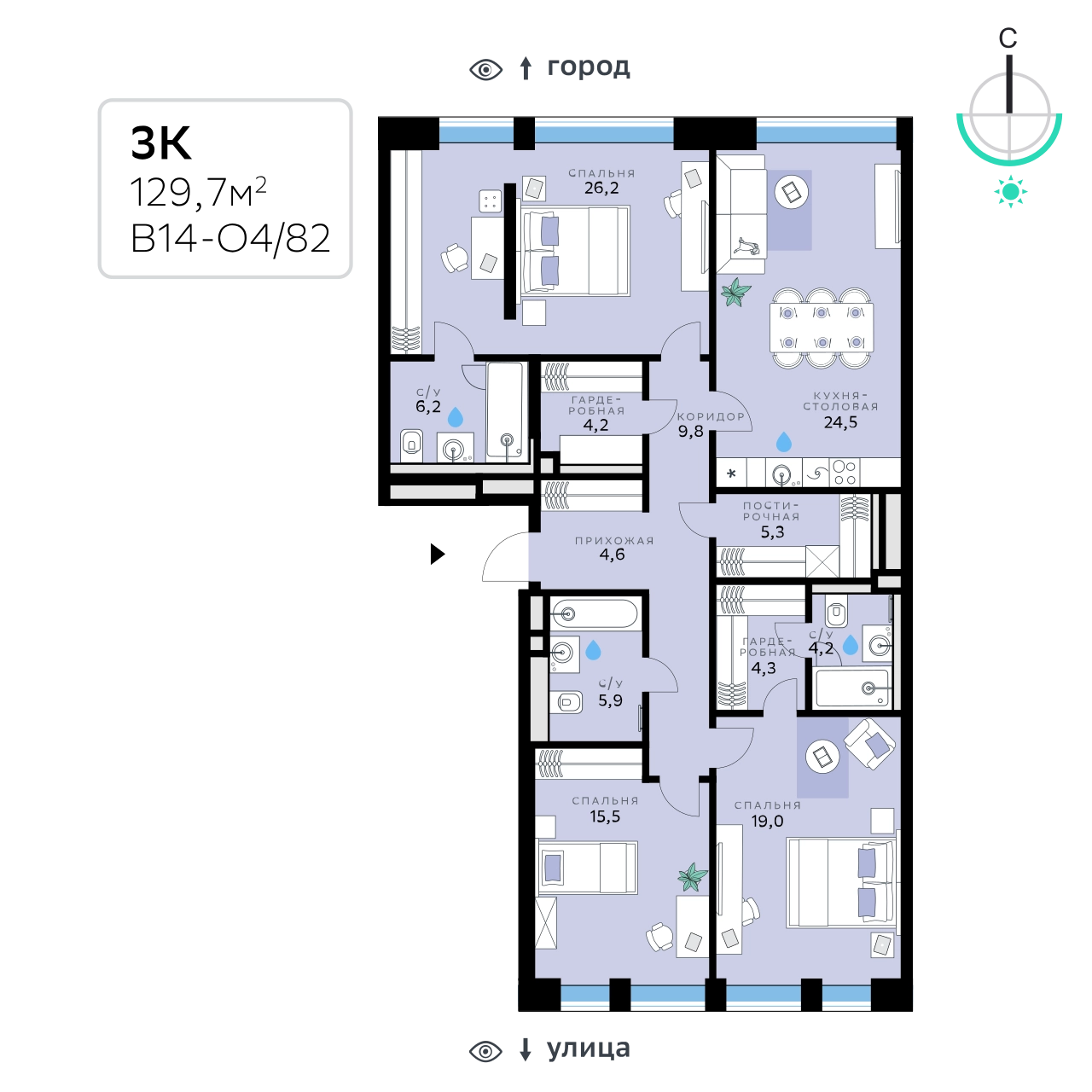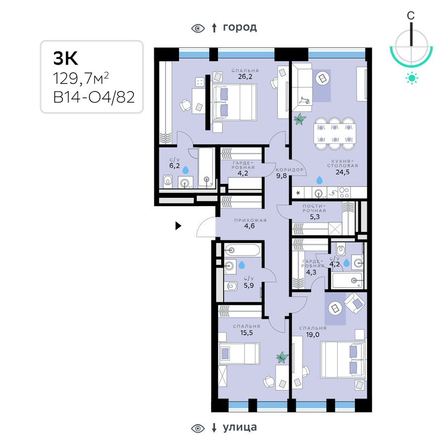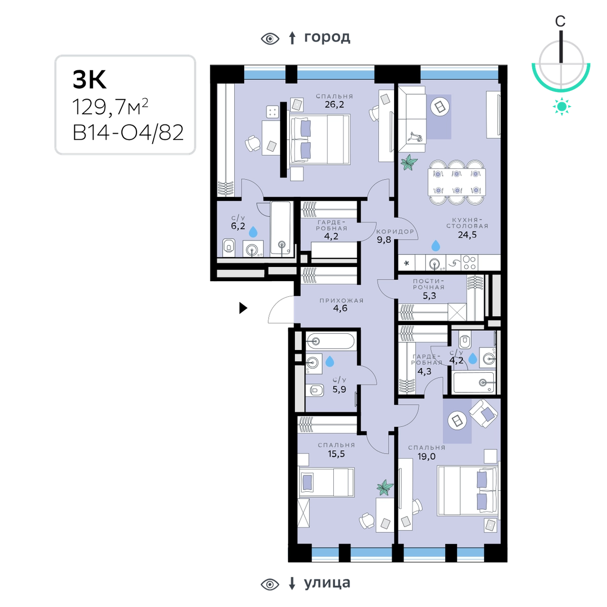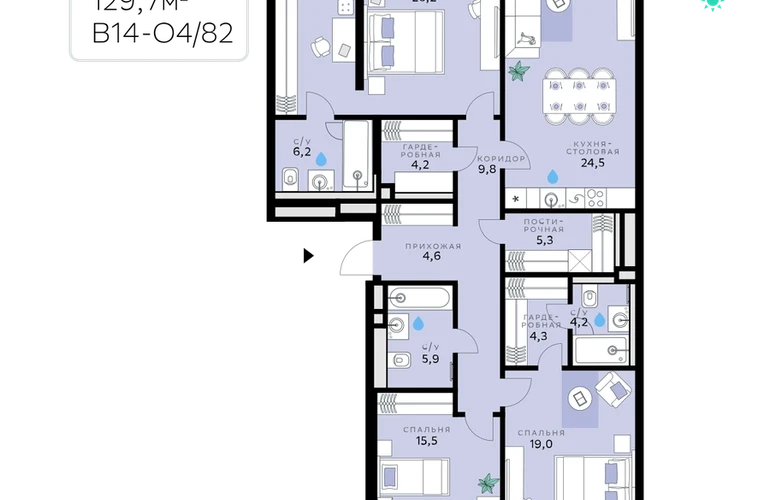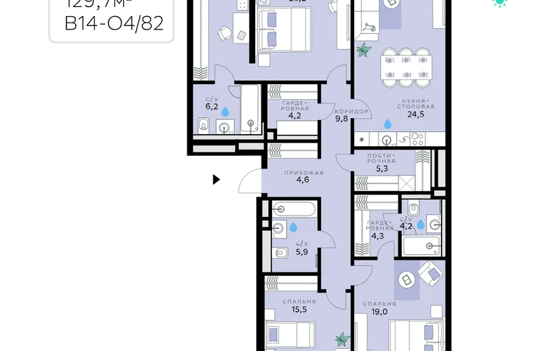 В продаже — трехкомнатная квартира, общей площадью 129,7 кв. м. Квартира расположена на шестом этаже десятиэтажного корпуса Оптимум в квартале В14 нового района СберСити, который строит Сбер.Архитектуру корпусов квартала разработало итальянское бюро. В облике отражена природная палитра: фасады выполнены в тёплой гамме и отличаются геометричной сеткой объёмных элементов светло-бежевого оттенка. За ними скрываются вставки с текстурой под дерево, создающие игру света и тени. Из окон открываются виды на парк и реку, а всего в трёх минутах пешком — набережная. В14 примыкает к главному парку СберСити. В квартале — уютные дворы без машин с крупномерными растениями, кустарниками, многолетними цветами, детскими площадками и зонами отдыха.