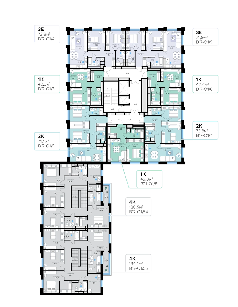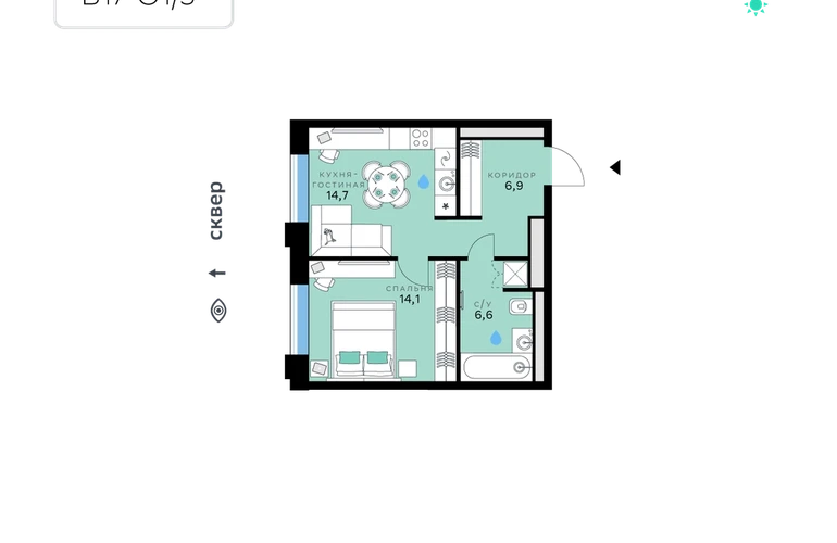 В продаже — однокомнатная квартира, общей площадью 42,3 кв. м. Квартира расположена на втором этаже десятиэтажного дома класса Оптимум в квартале В17 нового района СберСити, который строит Сбер. Всего в доме — 55 квартир.Квартал В17 — современная интерпретация голландской архитектуры. Каждый корпус имеет индивидуальный облик. В домах класса Оптимум используется лаконичная крупноформатная облицовка стеклофибробетоном и декоративными металлическими панелями. На верхних этажах расположены квартиры с панорамным остеклением и террасами, с которых открываются виды на город, парки и бульвар.