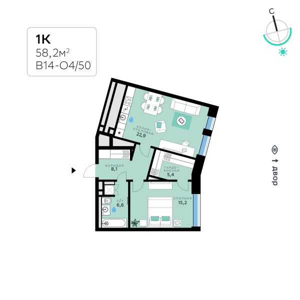 В продаже — однокомнатная квартира, общей площадью 58,2 кв. м. Квартира расположена на седьмом этаже девятиэтажного корпуса Оптимум в квартале В14 нового района СберСити, который строит Сбер.Архитектуру корпусов квартала разработало итальянское бюро. В облике отражена природная палитра: фасады выполнены в тёплой гамме и отличаются геометричной сеткой объёмных элементов светло-бежевого оттенка. За ними скрываются вставки с текстурой под дерево, создающие игру света и тени. Из окон открываются виды на парк и реку, а всего в трёх минутах пешком — набережная. В14 примыкает к главному парку СберСити. В квартале — уютные дворы без машин с крупномерными растениями, кустарниками, многолетними цветами, детскими площадками и зонами отдыха.