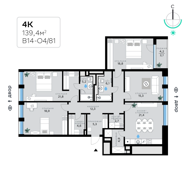 В продаже — четырехкомнатная квартира, общей площадью 139,4 кв. м. Квартира расположена на пятом этаже десятиэтажного корпуса Оптимум в квартале В14 нового района СберСити, который строит Сбер. Архитектуру корпусов квартала разработало итальянское бюро. В облике отражена природная палитра: фасады выполнены в тёплой гамме и отличаются геометричной сеткой объёмных элементов светло-бежевого оттенка. За ними скрываются вставки с текстурой под дерево, создающие игру света и тени. Из окон открываются виды на парк и реку, а всего в трёх минутах пешком — набережная. В14 примыкает к главному парку СберСити. В квартале — уютные дворы без машин с крупномерными растениями, кустарниками, многолетними цветами, детскими площадками и зонами отдыха. Дом возводится по технологии монолитного строительства. Фасады отделаны крупноформатными панелями из стеклофибробетона с фактурой натурального камня и HPL-панелями под дерево. В квартирах предустановлена система «умный дом», связывающая квартиру, дом и прилегающую территорию. Можно регулировать климат и освещение голосом или со смартфона, установлена защита от протечек. Повышенная шумоизоляция и двухкамерные стеклопакеты с алюминиевым профилем обеспечивают комфорт и тишину. В санузлах установлен тёплый пол. В доме предусмотрены: – уютное лобби, – общественная терраса, – детская игровая комната на первом этаже, – лапомойка, – колясочная и велосипедная комната на первом этаже, – подземный паркинг. СберСити — это новый жилой и деловой район на западе Москвы, в одном из самых экологически чистых и престижных мест столицы. Это первая в России и крупнейшая в мире инновационная городская среда, созданная по международным стандартам зелёного проектирования. Здесь внедряются решения в области энергоснабжения, вакуумного мусороудаления, тестирования зелёных технологий, а в дальнейшем — системы искусственного интеллекта для управления домами и городской инфраструктурой. Строительство проекта началось в 2021 году, заселение первых корпусов — с лета 2024-го. Общая площадь территории — 461 га, из них более 2,5 млн кв. м жилья и около 833 тыс. кв. м офисных пространств. Будет построено 7 школ, 13 детских садов и 2 поликлиники. В СберСити будут жить 65 тыс. человек и работать 70 тыс. Развитием территории занимается АО «Рублёво-Архангельское», входящее в группу Сбер. СберСити — место, где хочется жить, работать и растить детей. Переезжайте в СберСити!О застройщике