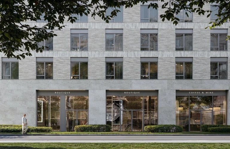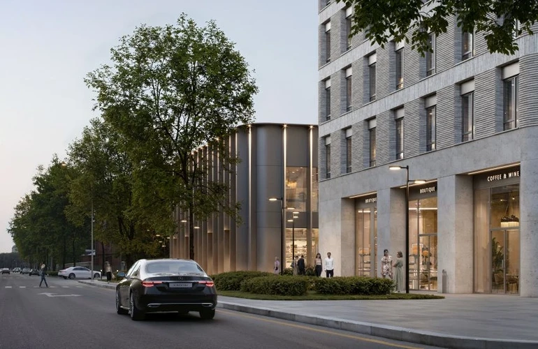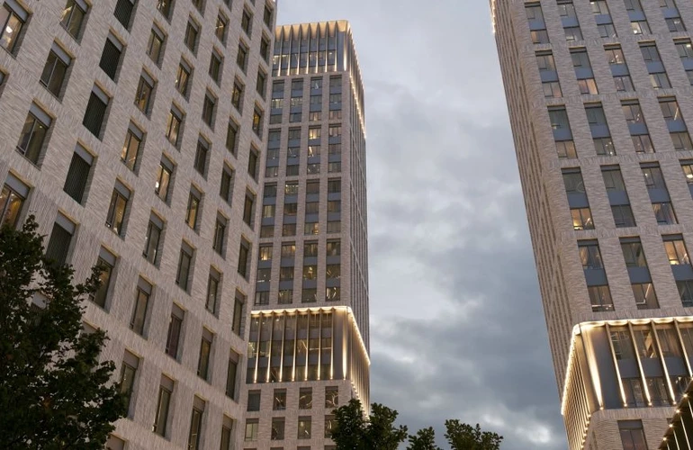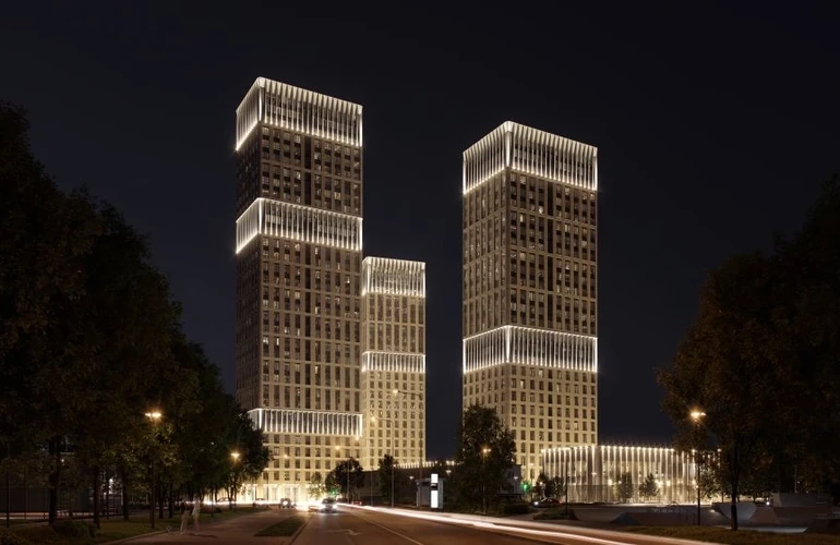 Три корпуса разной высоты формируют выразительный силуэт комплекса. Архитектурный проект разработан московским бюро WALL, известным работой над премиальными жилыми и офисными зданиями.