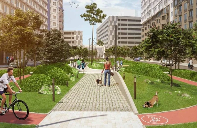 Просторные дворы с детскими площадками и гостевыми парковками.
